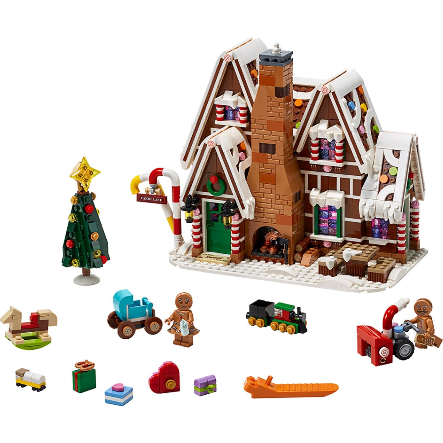 - The Gingerbread House features frosted roofs with colourful candy buttons, a rich facade with candy cane columns and walking sticks, glittery windows and a tall chimney stack with a glowing fireplace, plus a detailed interior, brick-built baby carriage and a snow blower.