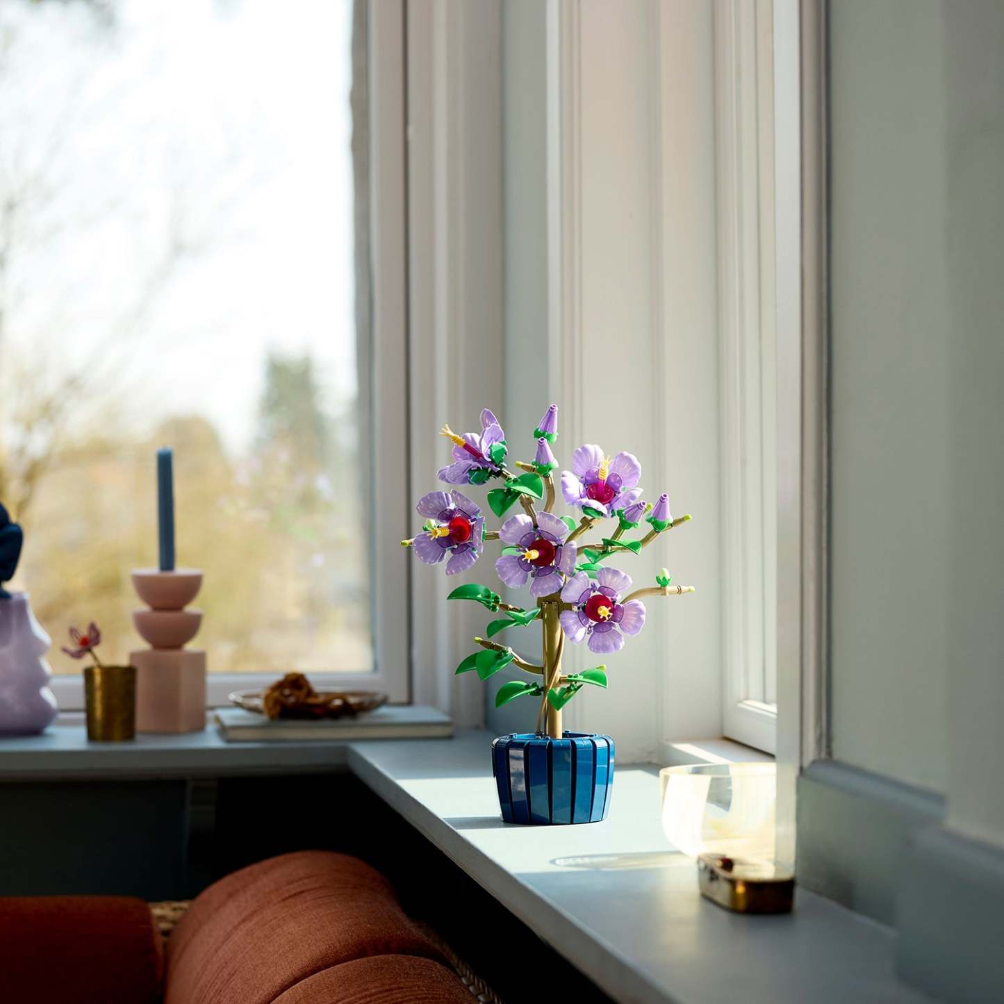 Enjoy building the LEGO plant, which features 5 large blooms, 4 flowers that are about to blossom and 2 young flower buds, before discovering the details. Capturing the gentle beauty of nature, the large blooms have lavender-coloured petals and yellow stamens, while the leaves are pale green. Once you’ve finished building the hibiscus, you can move the petals and position the leaves to add a touch of customisation to your creation.