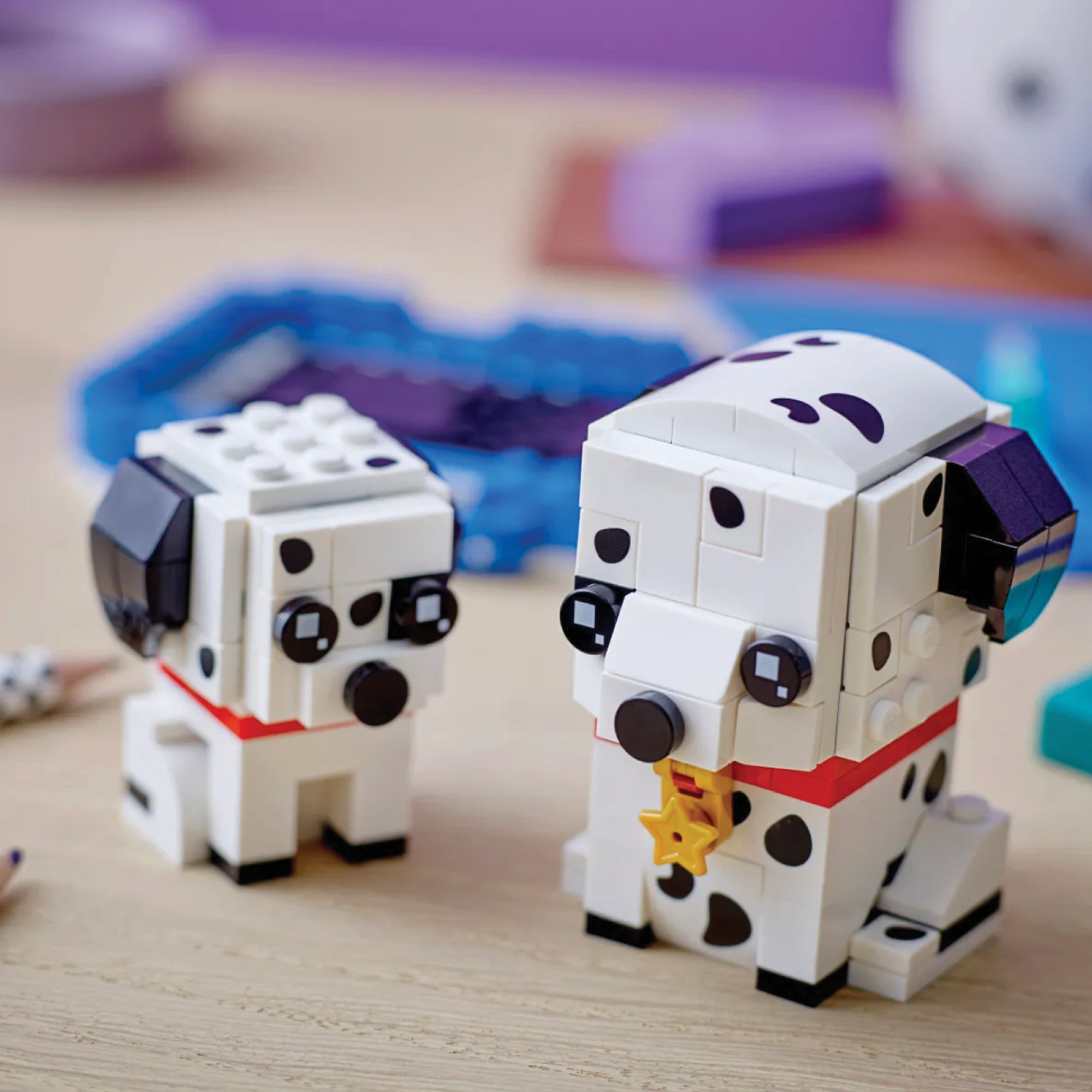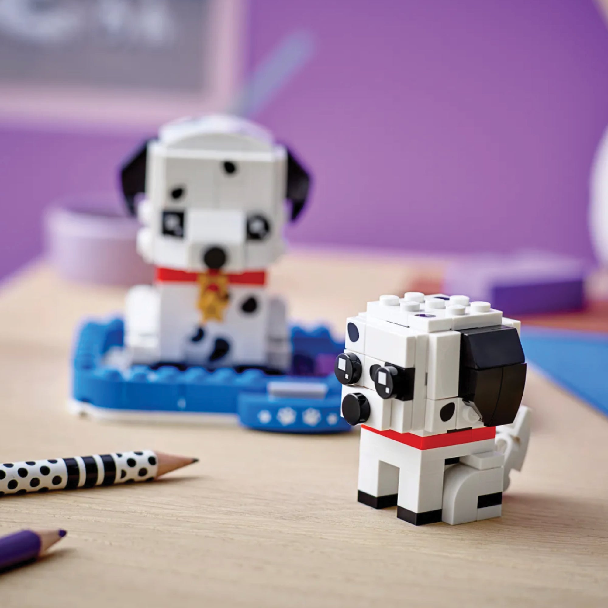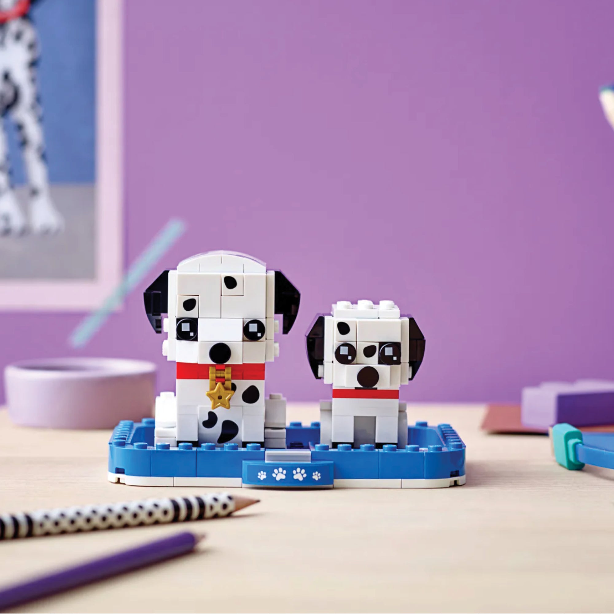 Kids who like cute dogs will love this build-and-display BrickHeadz™ Dalmatian dog and puppy set. The bigger dog wears a little bell around its neck, which makes it look even more adorable. The spotted dogs sit together on a sturdy baseplate in a decorated basket, making this buildable pet set a great gift for all kids, BrickHeadz collectors and pet lovers.