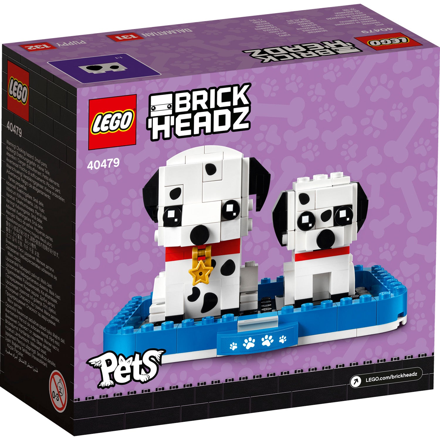 - Collectible construction set featuring fun LEGO® BrickHeadz™ models of a Dalmatian dog and puppy sitting together in a basket.