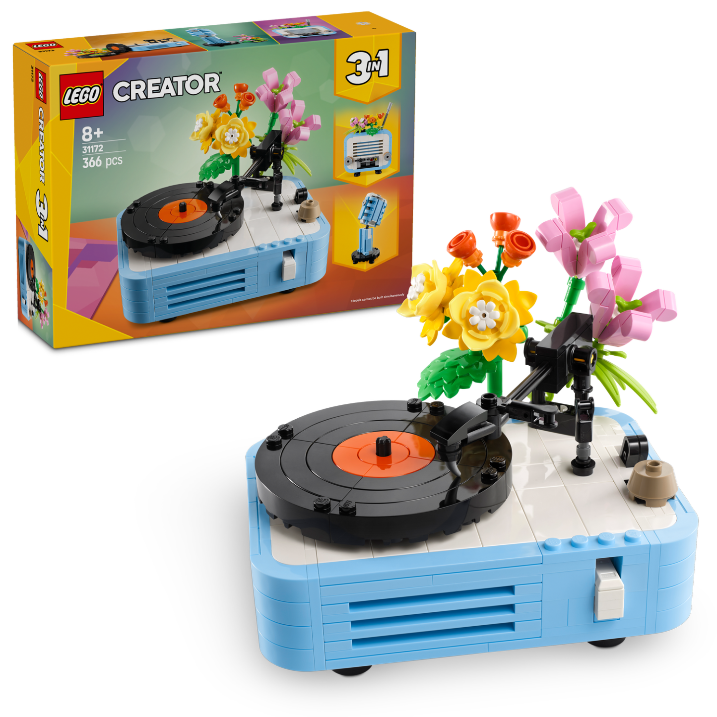 - 3 LEGO® music set building options in 1 box – The LEGO Creator 3in1 Record Player with Flowers toy playset lets kids aged 8 and up build and rebuild 3 different retro-style models with the same bricks