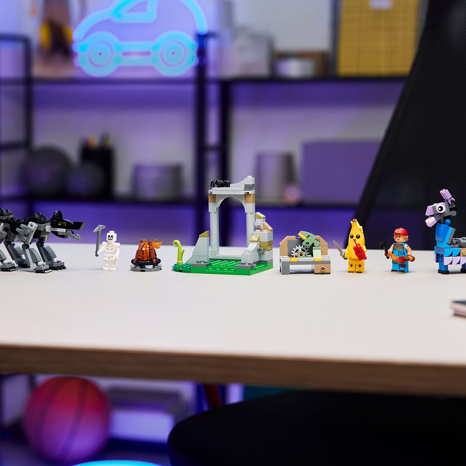 The playset replicates the first challenges players encounter in the LEGO Fortnite Odyssey video game, and boys and girls will have fun building the campfire, a workbench and ruins that can be deconstructed and reconfigured. It also features a Supply Llama figure and a wolf figure with a movable tail and legs. The action is brought to life by minifigures of Peely, Sparkplug and a skeleton, who come with weapon accessories to encourage imaginative role play.
