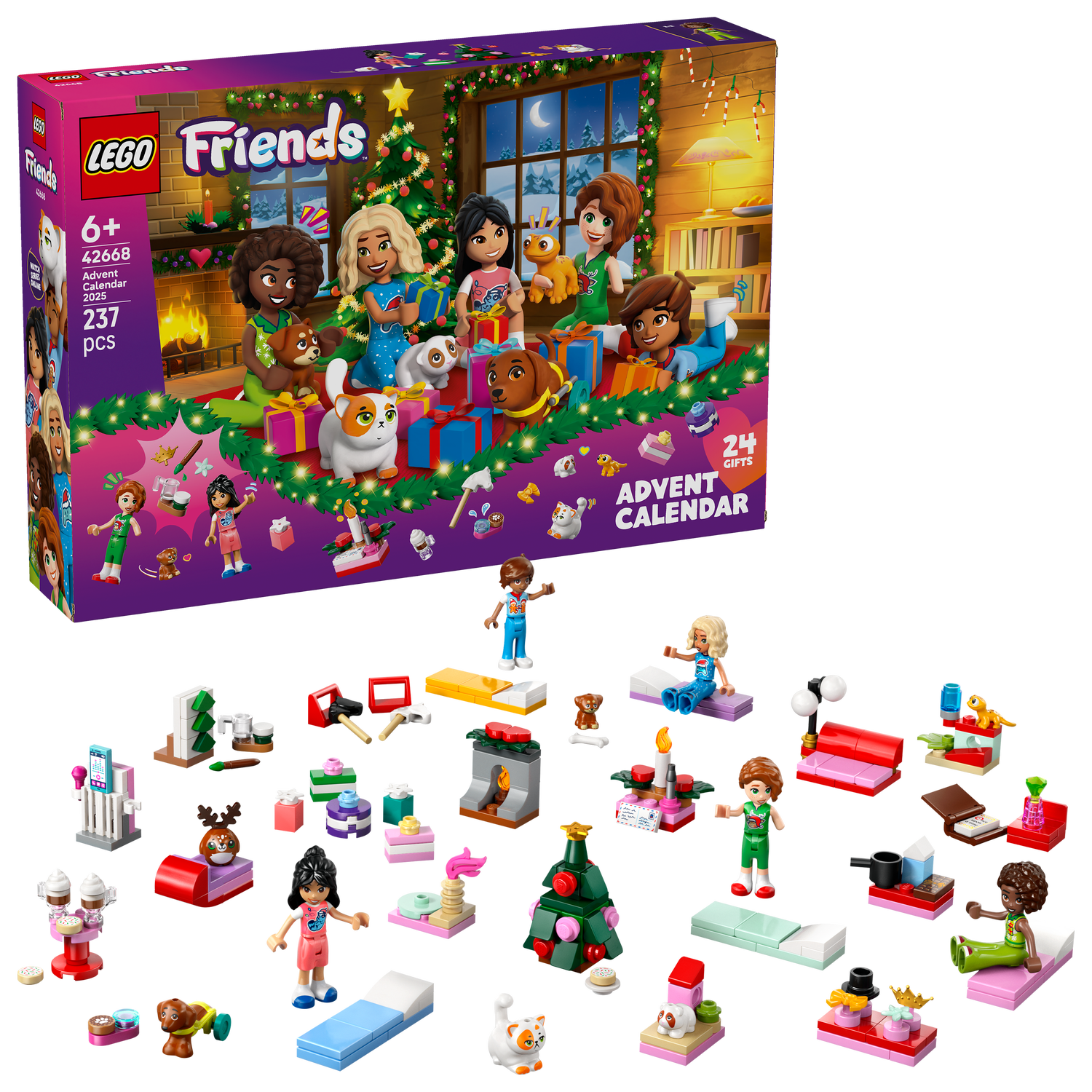 Inspire holiday cheer and cosy moments for girls and boys aged 6 and over as kids open the doors of the LEGO® Friends Advent Calendar 2025 (42668) toy building set. It comes with 5 minidolls, including Aliya, Autumn, Liann, Nova and Leo, plus 5 LEGO animals including 2 dogs, a guinea pig, a gecko and a cat figure.