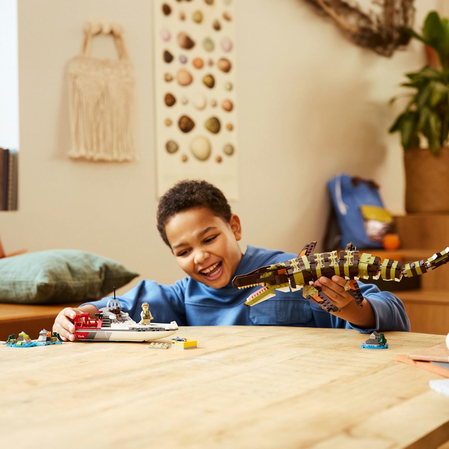 - Dinosaur action figure and more – A brick-built Mosasaurus figure with an articulated body, a toy boat vehicle with a dinosaur tracker, plus LeClerc and Atwater minifigures to inspire role play