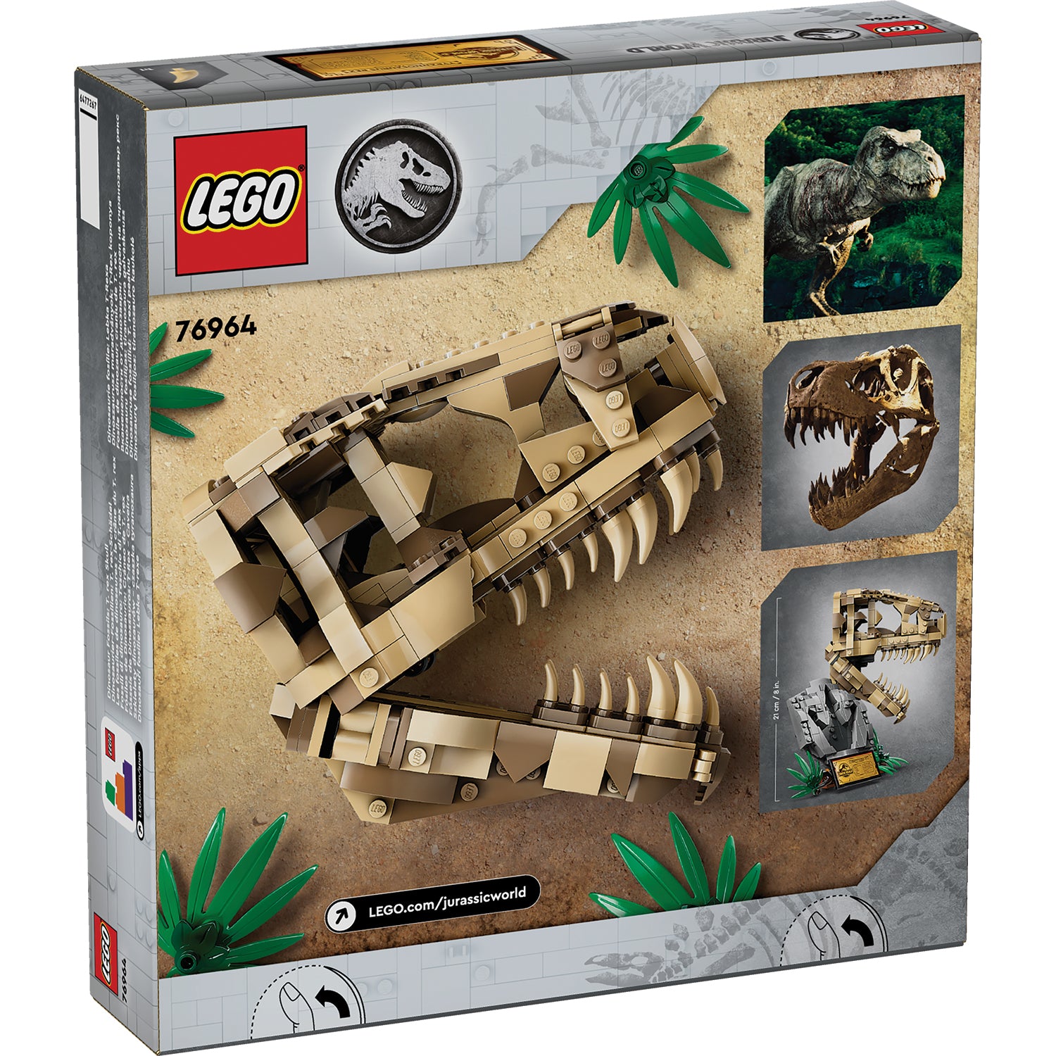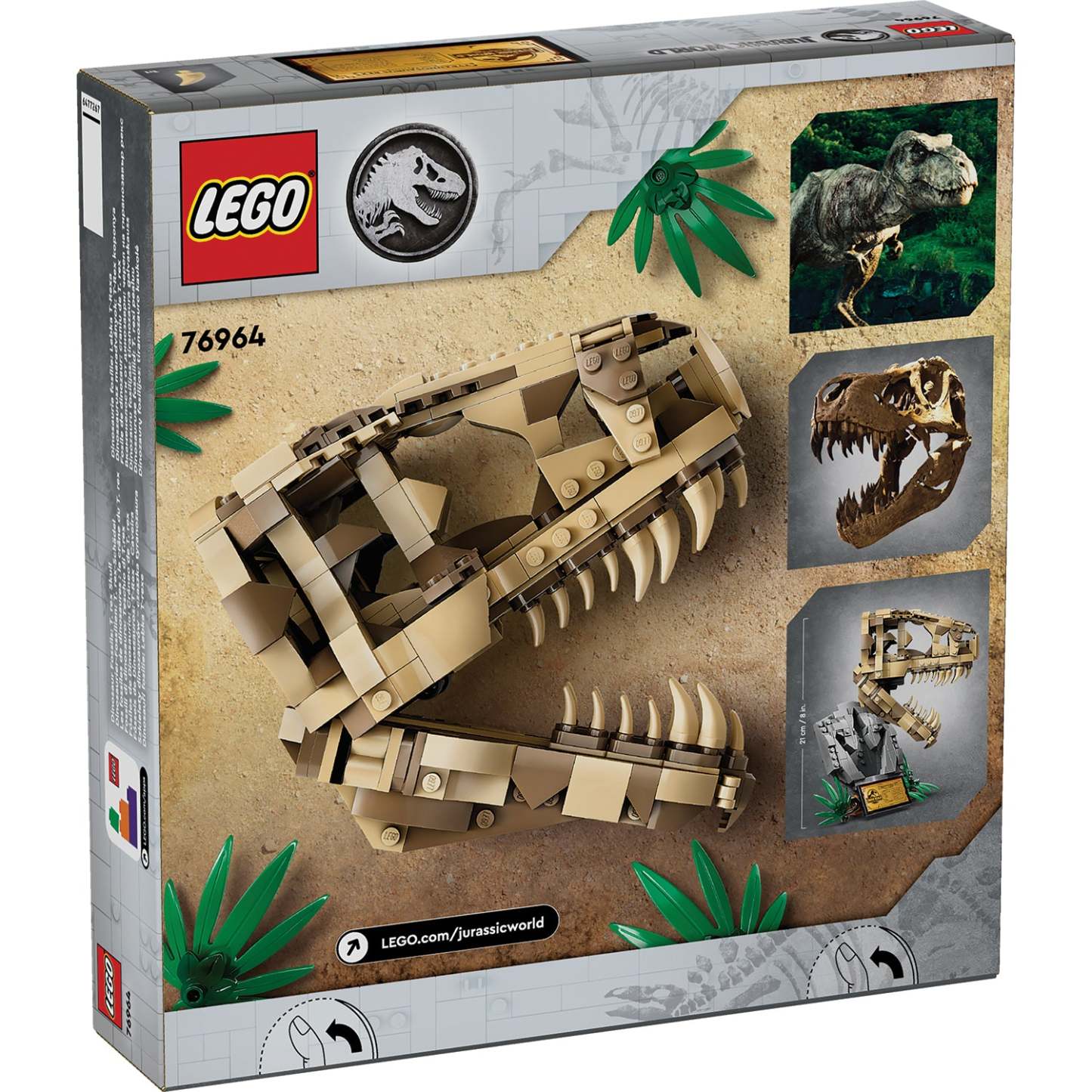 Inspire dinosaur-loving boys and girls or budding paleontologist aged 9 and over with this LEGO® Jurassic World Dinosaur Fossils: T. rex Skull (76964) dinosaur toy for kids. The first Jurassic World set made for display features a skull with an opening jaw, a stand with an information plaque, a hidden ‘amber’ piece at the back of the model and a ‘fossilised’ footprint.