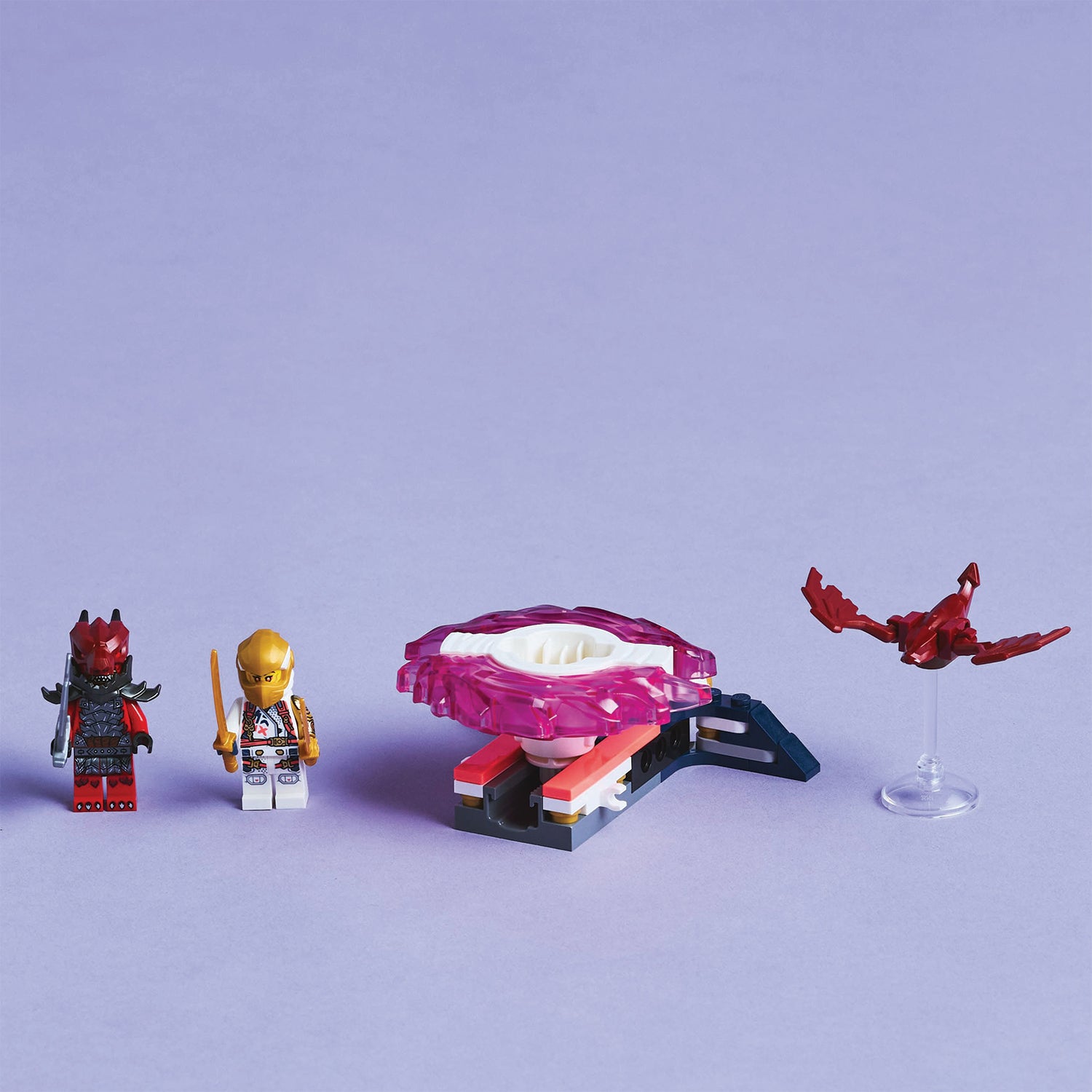 The small LEGO set also comes with 2 minifigures: Sora , who rides inside the dragon Spinjitzu spinner and has a sword accessory, a villainous Dragonian Warrior with his own sword accessory, plus a small dragon critter model. Kids can enjoy great role-play action as they stage good vs. evil battles with these popular NINJAGO characters.