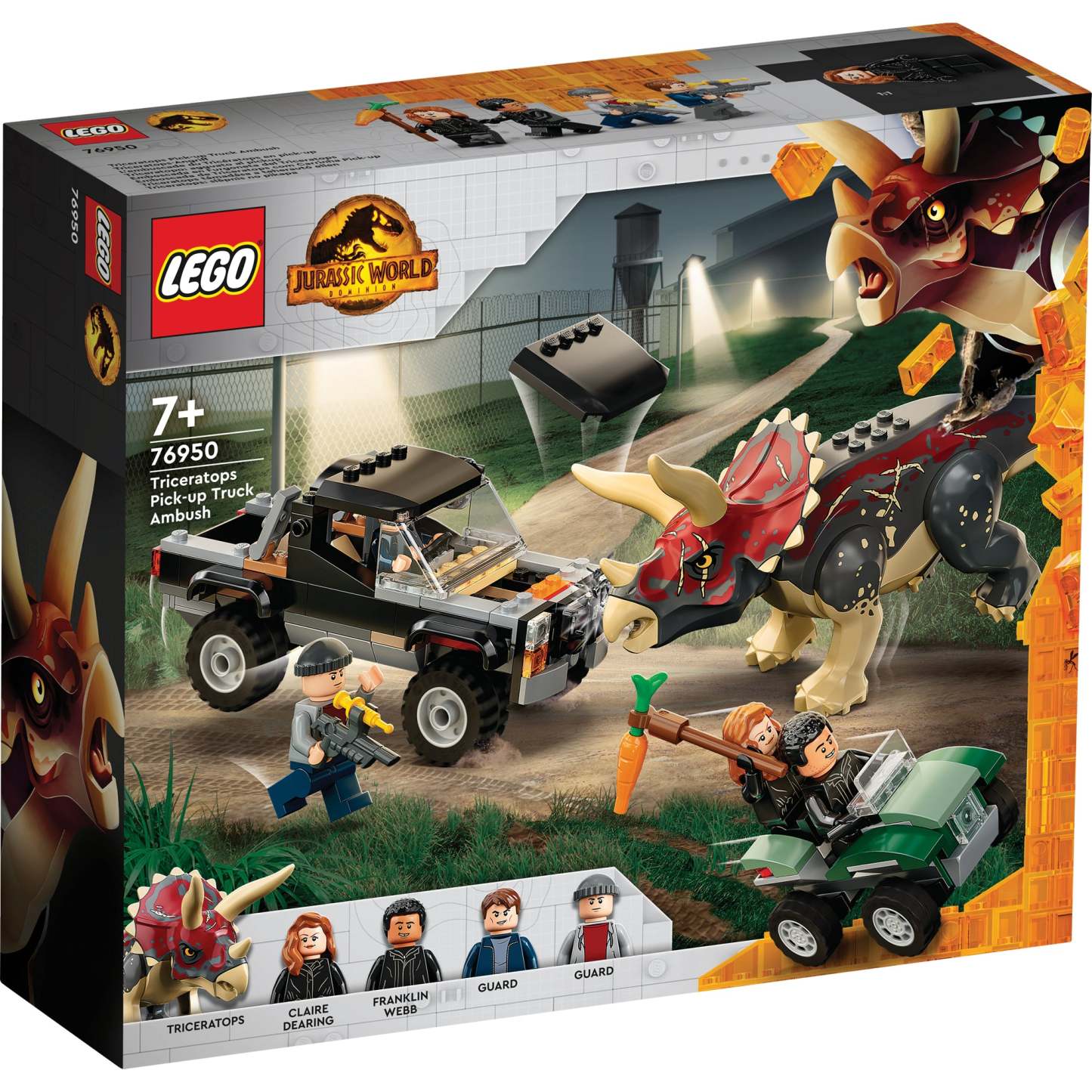 - Toy dinosaur and 4 minifigures – A posable Triceratops figure, Claire Dearing, Franklin Webb and 2 security guard minifigures, plus a tranquilliser and carrot accessory element for imaginative play