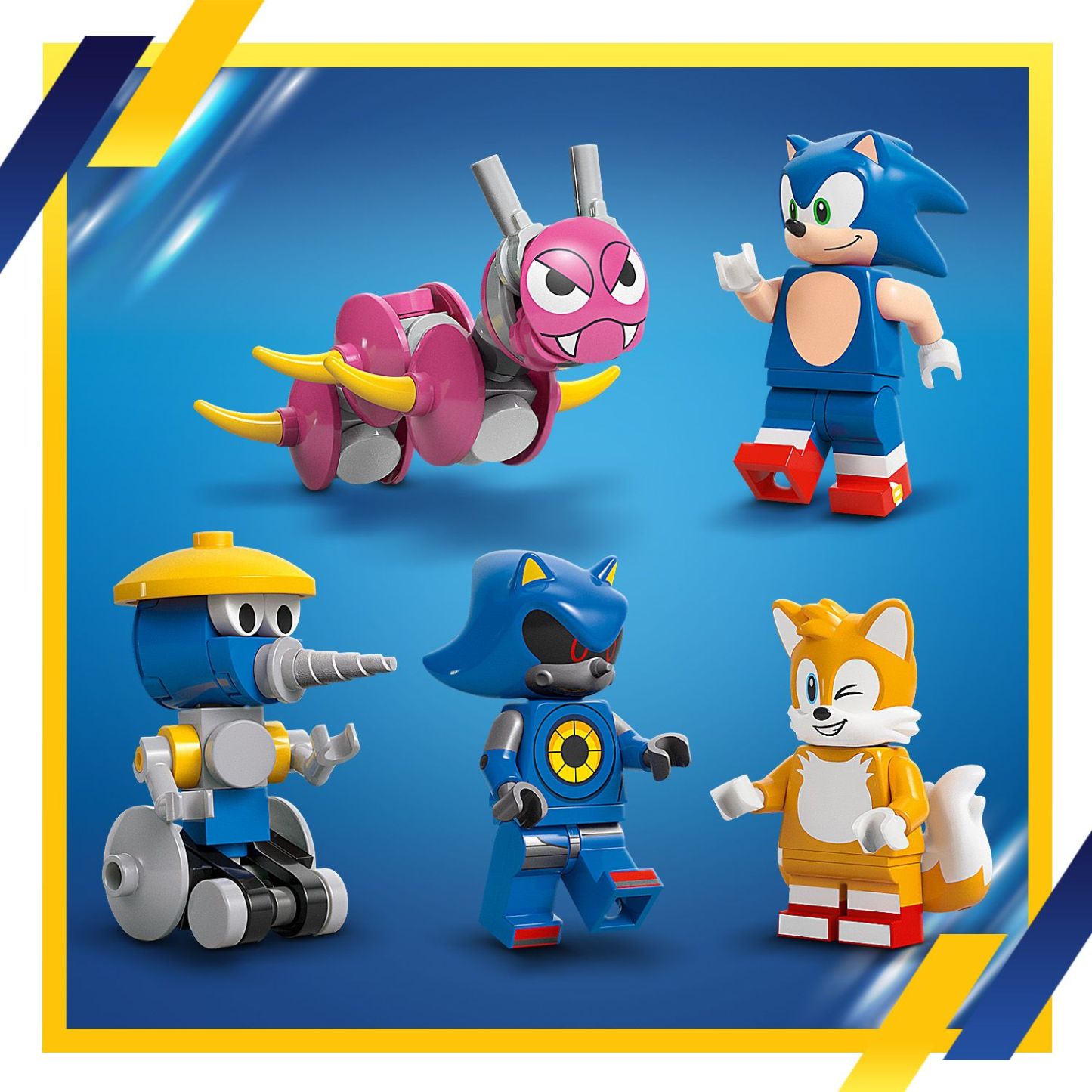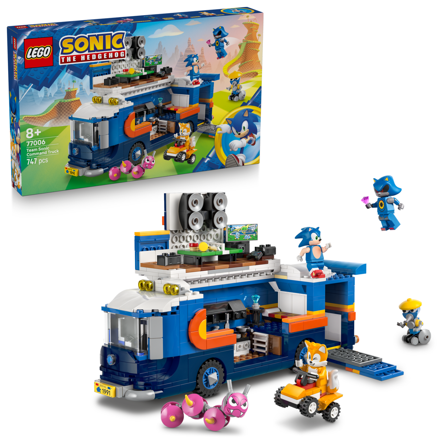 - The action’s inside – Features Sonic, Tails and Metal Sonic LEGO® minifigures, Burrobot and Caterkiller figures and a truck with a cabin, storage area and a ramp for an ATV toy