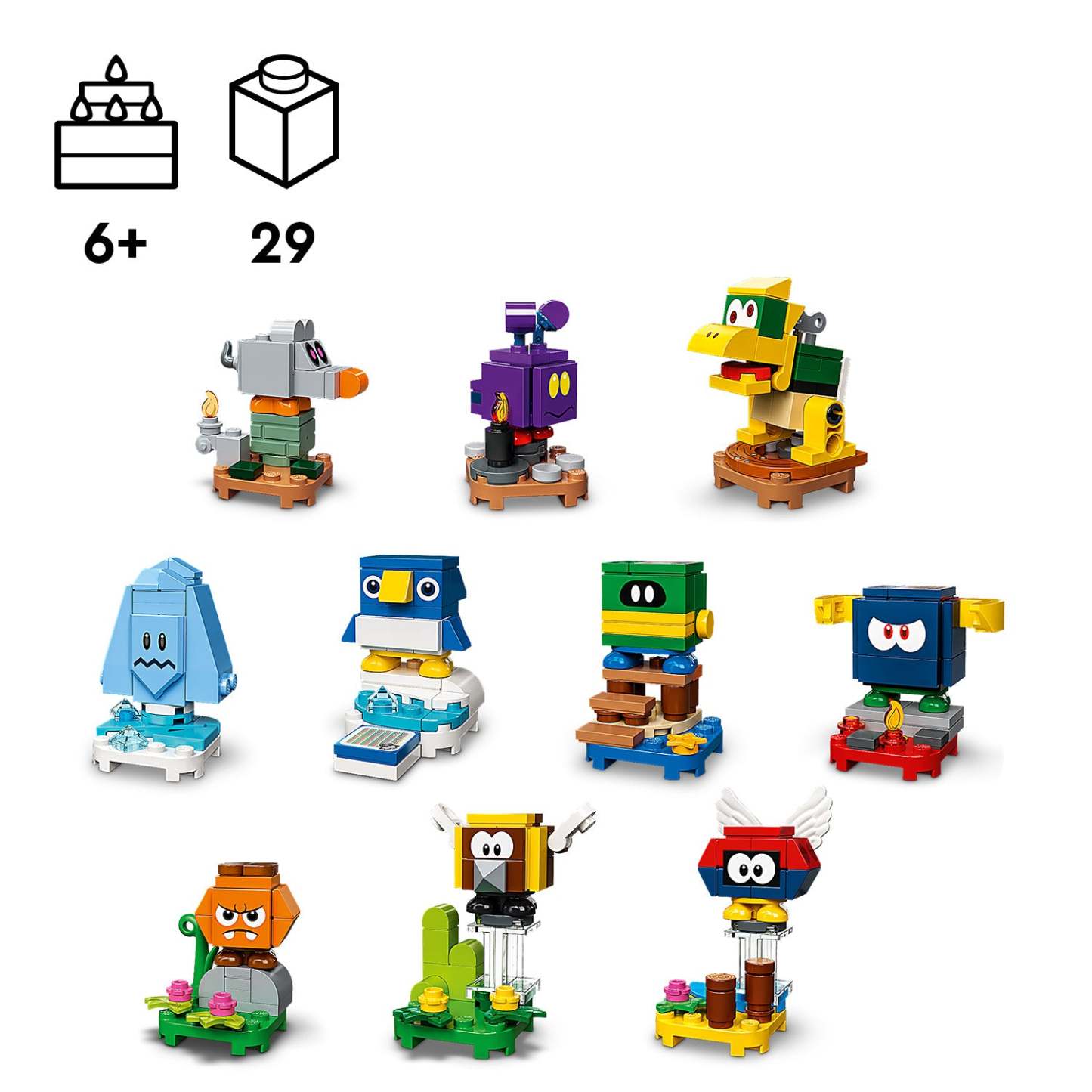 - 10 to collect, build and play with – A Mechakoopa, Para-Biddybud, Stingby, Bully, Freezie, Ant Trooper, Goombrat, Coin Coffer, Scaredy Rat and a baby penguin