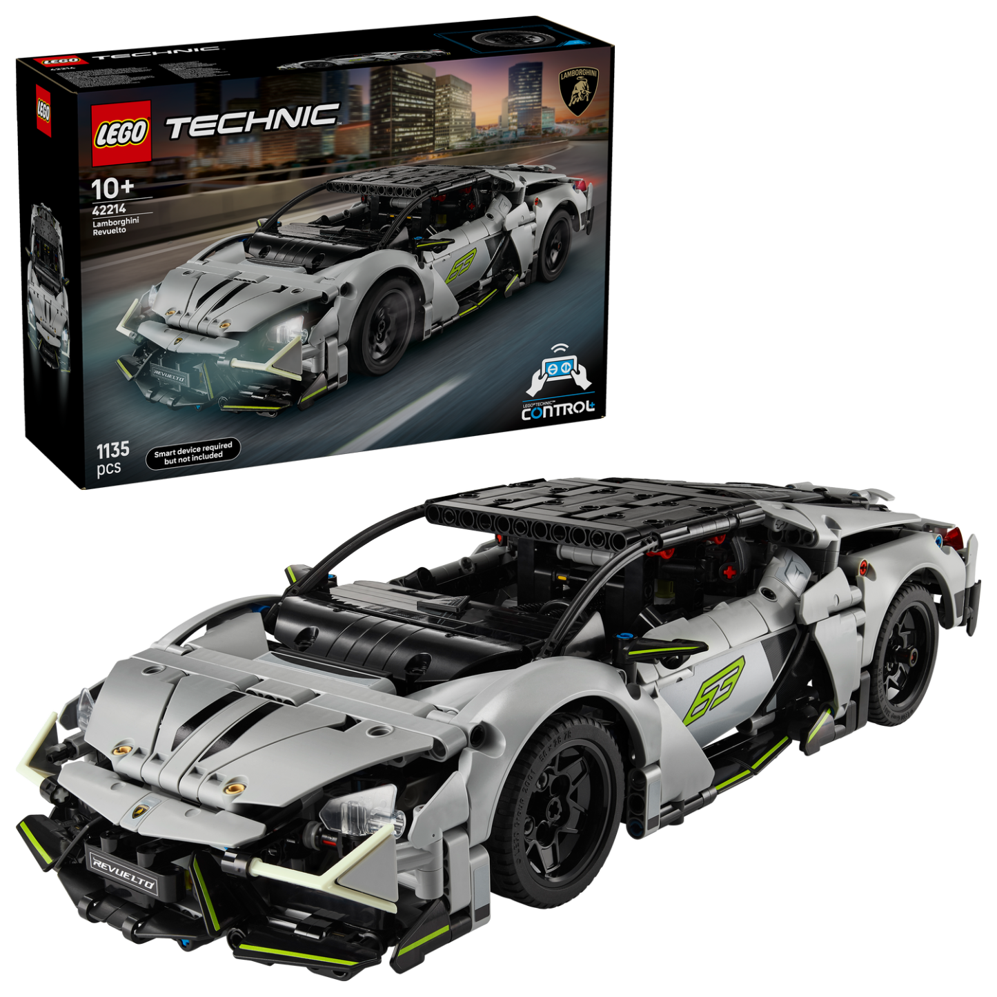 Inspire kids to build a detailed model version of the stunning Lamborghini Revuelto Super Sports Car with this LEGO® Technic STEM building toy (42214) for boys and girls aged 10 and over. With features inspired by the real-life car, this model includes an engine cover and cool glow-in-the-dark headlight details. Meanwhile, the sleek design is sure to impress any Lamborghini super fan. But the build is just the start with this fast-action set. Access the CONTROL+ app to steer the car, control the lights and see live data feedback from the app’s cockpit screen as kids perfect their driving skills. \