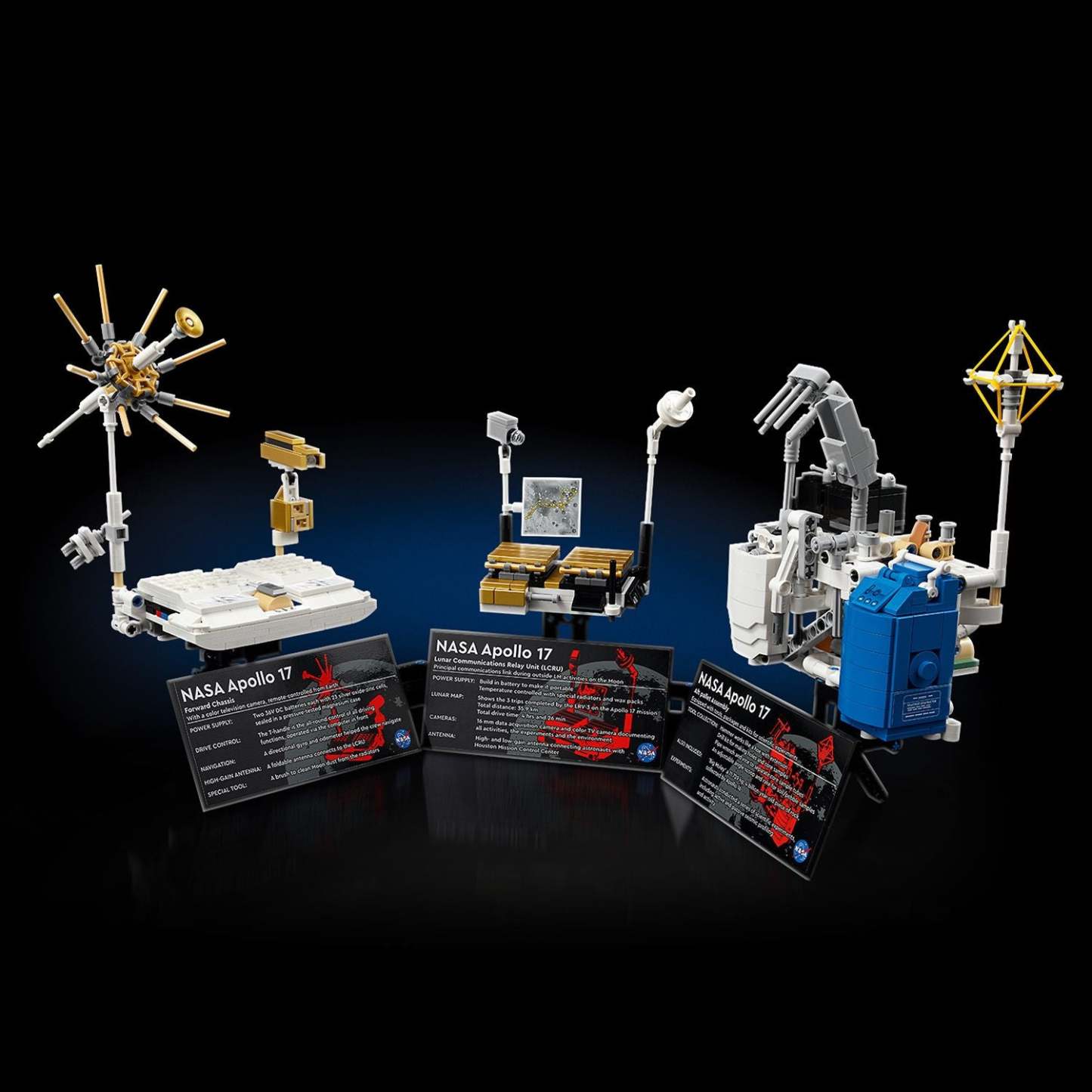 - A build for NASA fans – Remember the Apollo 17 mission with a display that features the lunar roving vehicle alongside 3 detailed equipment attachments, each with its own information plaque