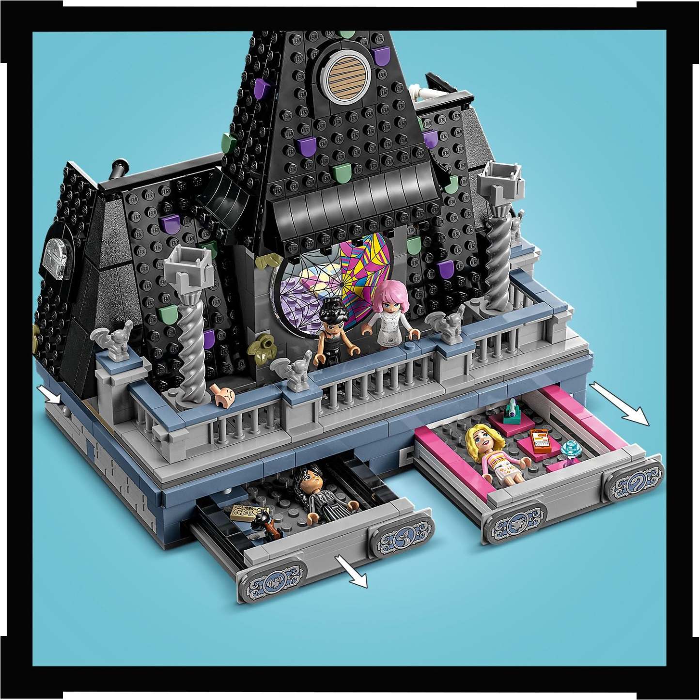 - Nevermore Academy set – The school playset includes a buildable dorm room with a spiderweb window that opens, a base with buttons that open secret drawers and a balcony with 4 gargoyles
