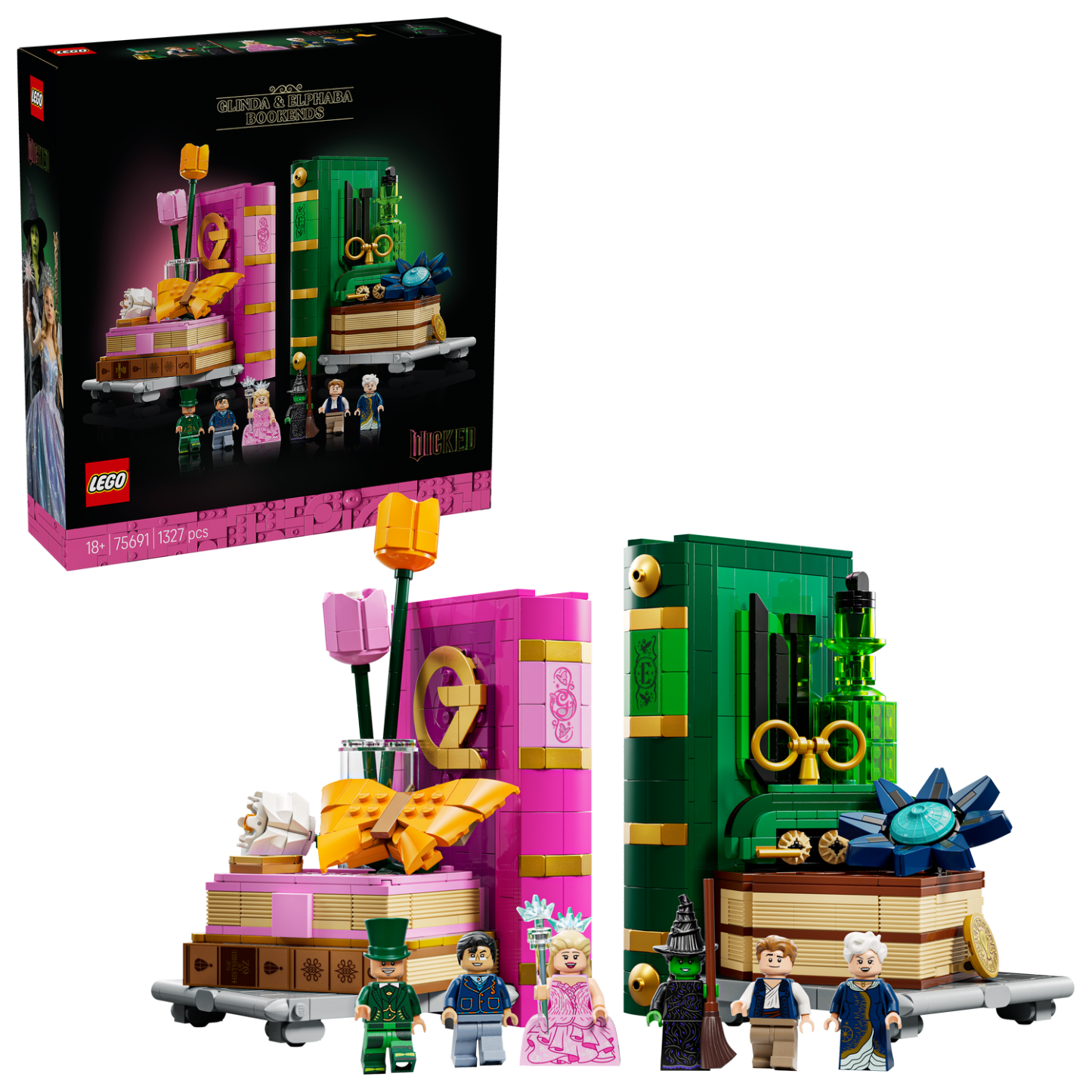 - Adult craft kit – Glinda's bookend houses a model of Shiz University and has a diary build that fits 2 minifigures, and Elphaba’s features Emerald City and the Grimmerie, which fits The Wizard and Fiyero