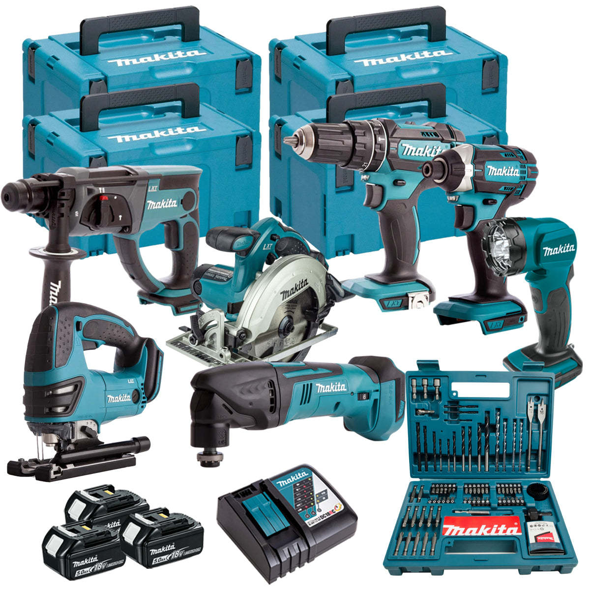 Makita 18V 7 Piece Power Tool Kit with 3 x 5.0Ah Battery Charger & 100 Piece Bit Set T4TKIT-16452